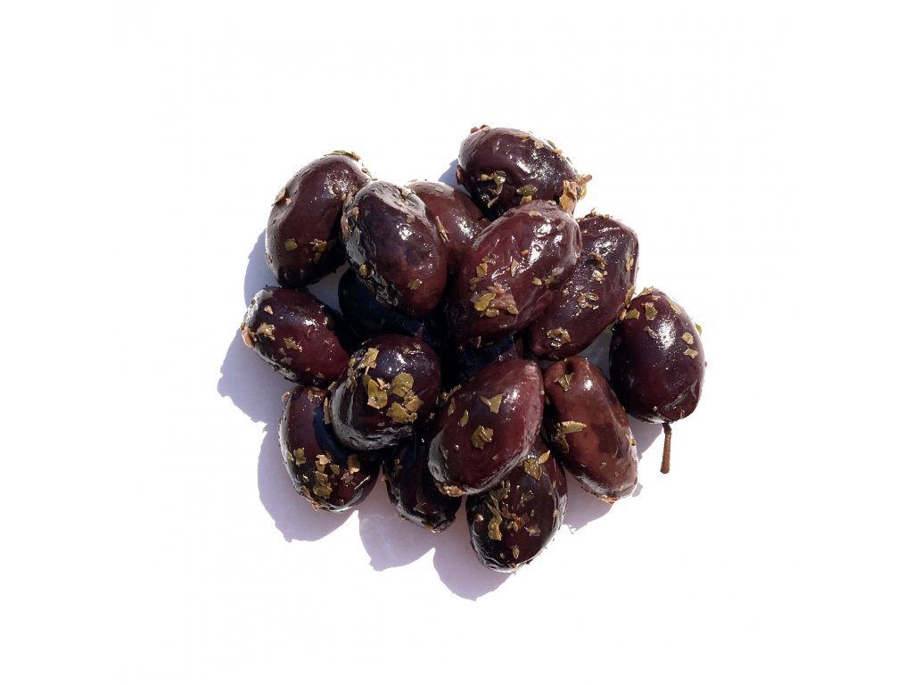 Krétské olivy Kalamata s oreganem a česnekem