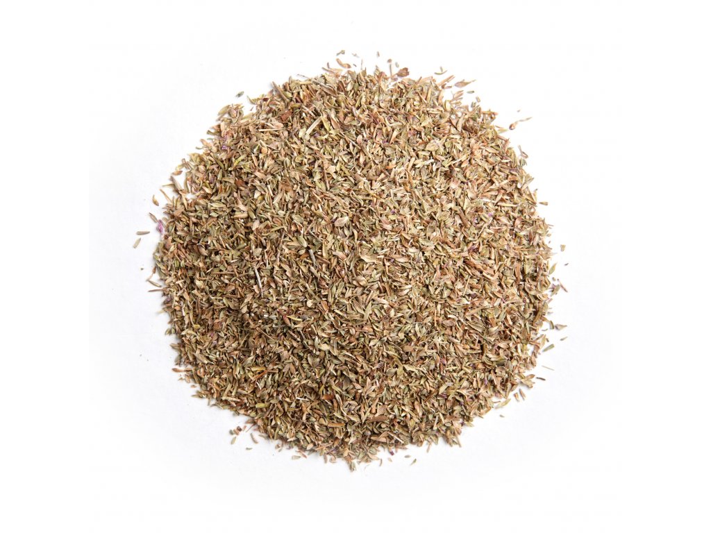 Sušené listy krétského tymiánu obecného - je divoký, sklízený v horách Kréty v květu, s fialovými kvítky