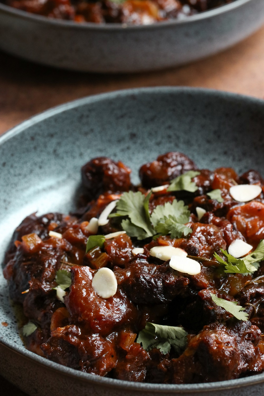 - Podáváme s plátky mandlí a koriandru. Jako přílohu můžeme zvolit bramborové pyré, rýži nebo pečenou kořenovou zeleninu.