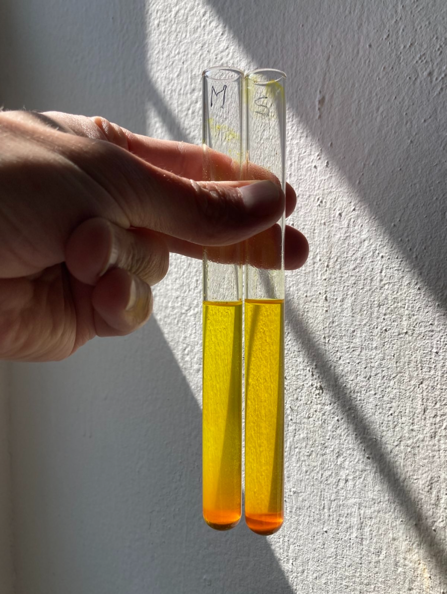 Porovnávali jsme vizuálně obsah barviva kurkuminu v naší kurkumě s jinou kvalitní kurkumou, která má obsah kurkuminu 4,5-5% (to je vysoké množství). V obou zkumavkách je stejné množství isopropanolu, ve kterém se kurkumin velmi ochotně rozpouští, a stejné množství od každé kurkumy: 0,25g. Vpravo je naše kurkuma, vlevo je druhá kvalitní kurkuma. Výsledek můžete posoudit sami: